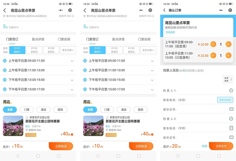 4 确认信息无误后,填写游览人姓名,身份证,联系电话