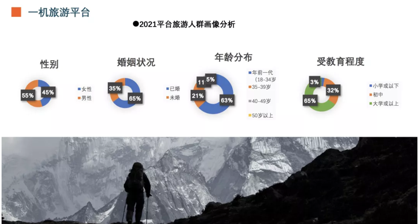 根据平台旅游大数据人群画像分析,平台使用男性占比55%,女性占比45%,未婚占65%,已婚占比35%,出游年龄易18-35岁的年轻人居多,受教育程度也在大学以上占比65%。